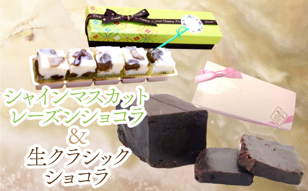 甘酸っぱいホワイトチョコレートで美味しさ際立つシャインマスカットレーズンショコラと葡萄の里の逸品、生クラシックショコラのセットです。
