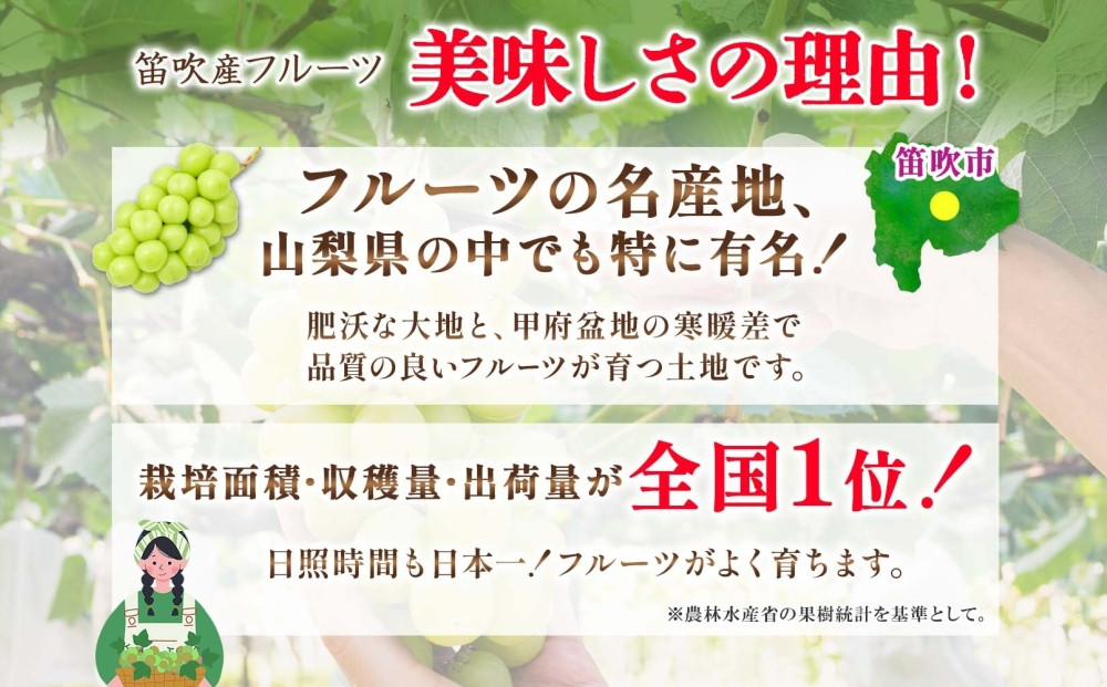 山梨県笛吹市で育った、甘さと爽やかさを兼ね備えたシャインマスカットです。