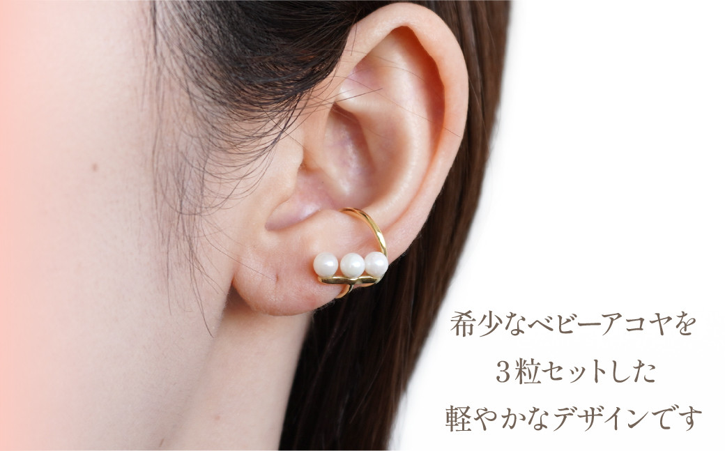 希少なベビーアコヤを3粒セットした軽やかなデザインは顔回りに明るい輝きを添えてくれます。