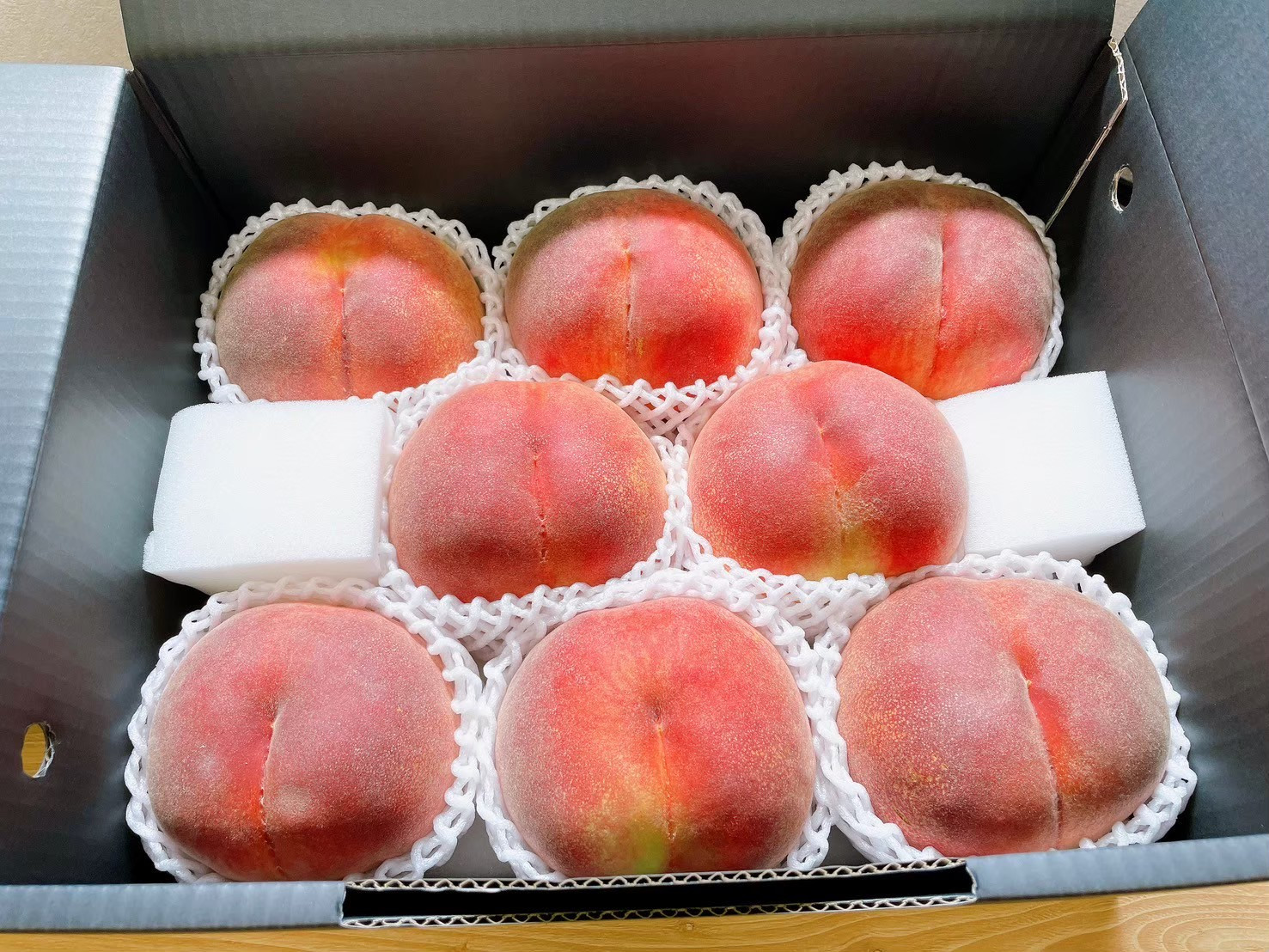 桃は繊細な果実です。朝もぎしてからその日のうちに箱詰めし、鮮度の一番高い状態で産地直送いたします。肥沃な土壌から十分な栄養を吸った大玉の旬の果実は期間限定の贅沢品。