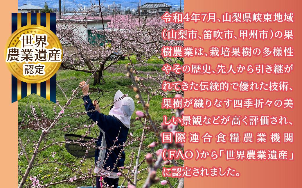 そして2022年7月には、山梨県の峡東地域(笛吹市、甲州市、山梨市)に広がる扇状地を活用した果樹栽培が県内で初めて「世界農業遺産」に認定されました✨