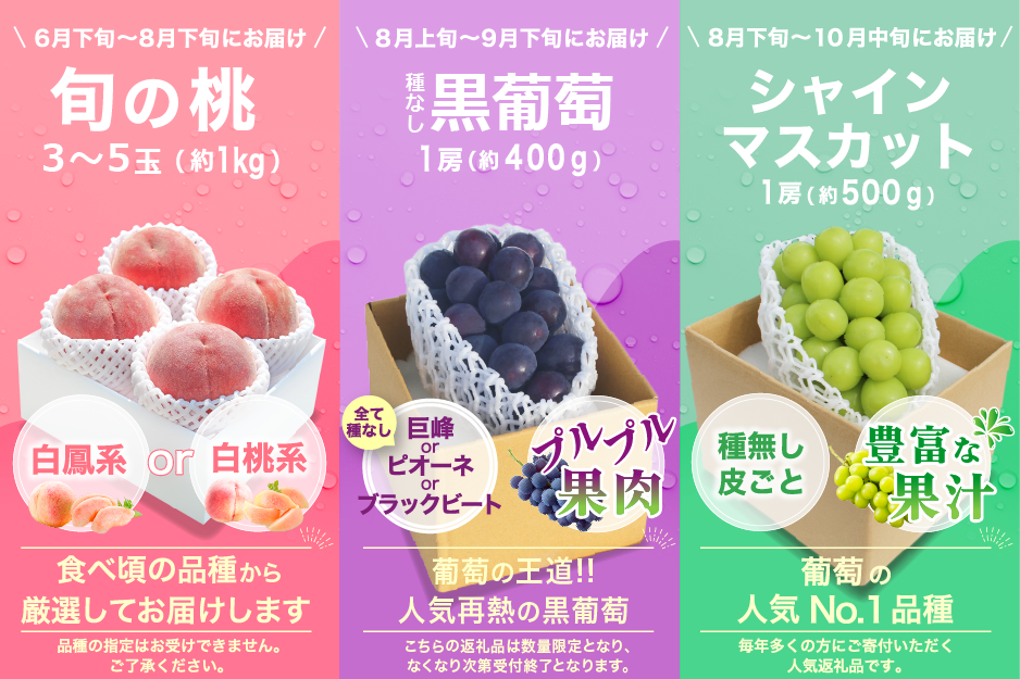 桃:6月下旬~8月下旬 黒葡萄:8月上旬~9月下旬 シャインマスカット:8月下旬~10月中旬 ※収穫状況により出荷日は変動いたしますのでご了承ください。 ※沖縄・離島は配送不可 |
