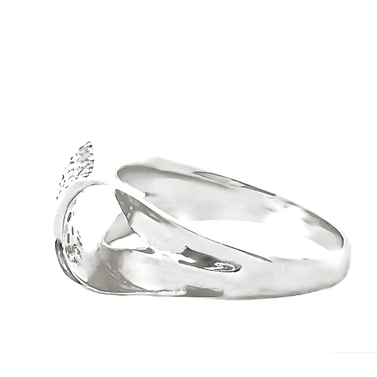 地金の鏡面の腕の上に、ドーム型にふっくらした形状でパヴェ留めされたダイヤモンドが煌めく指輪です。