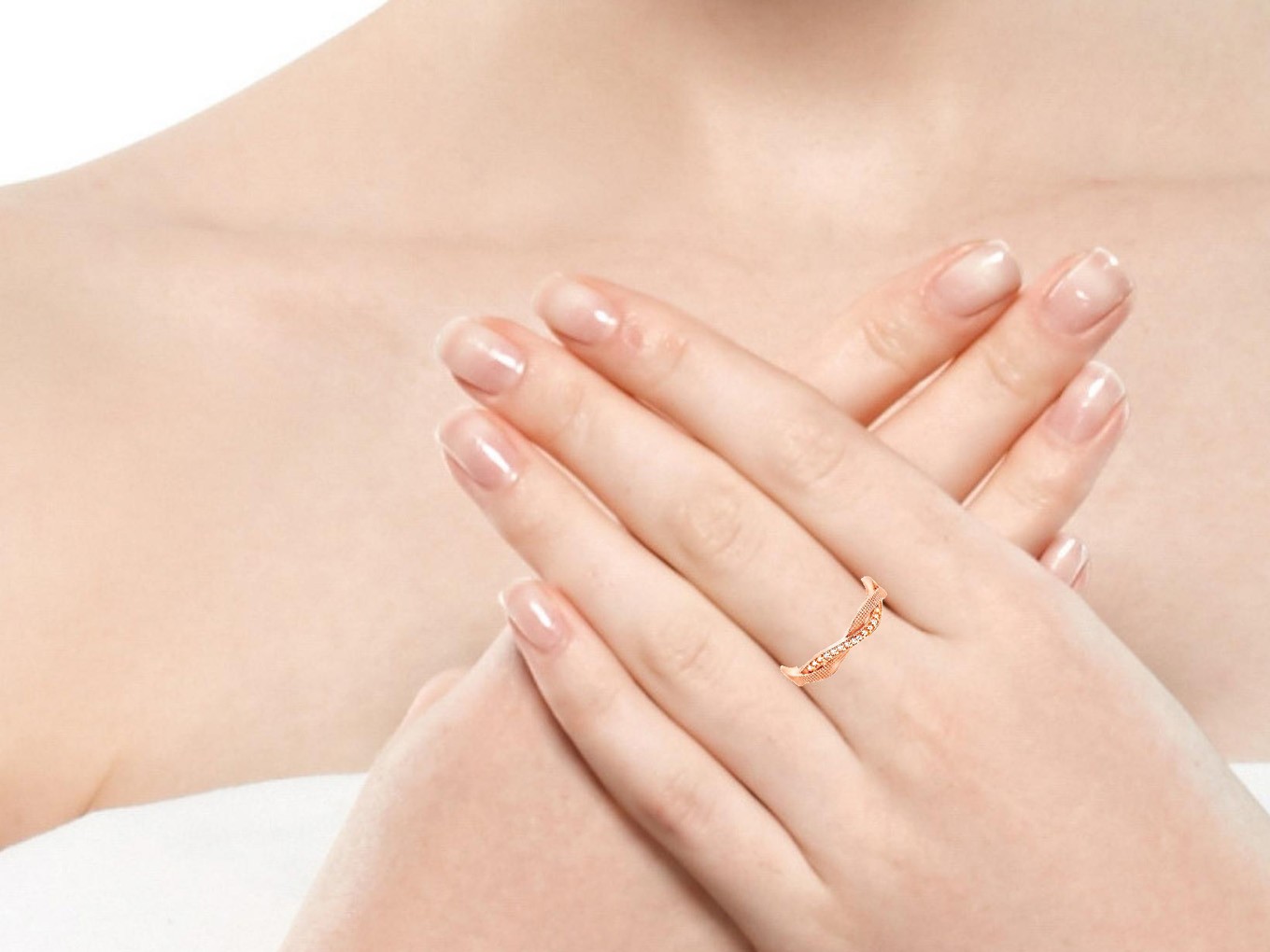 地金部分がねじれた様に交差し、そのうち片方にダイヤモンドが並んで全体がエレガントなラインで仕上がっているこちらの指輪は