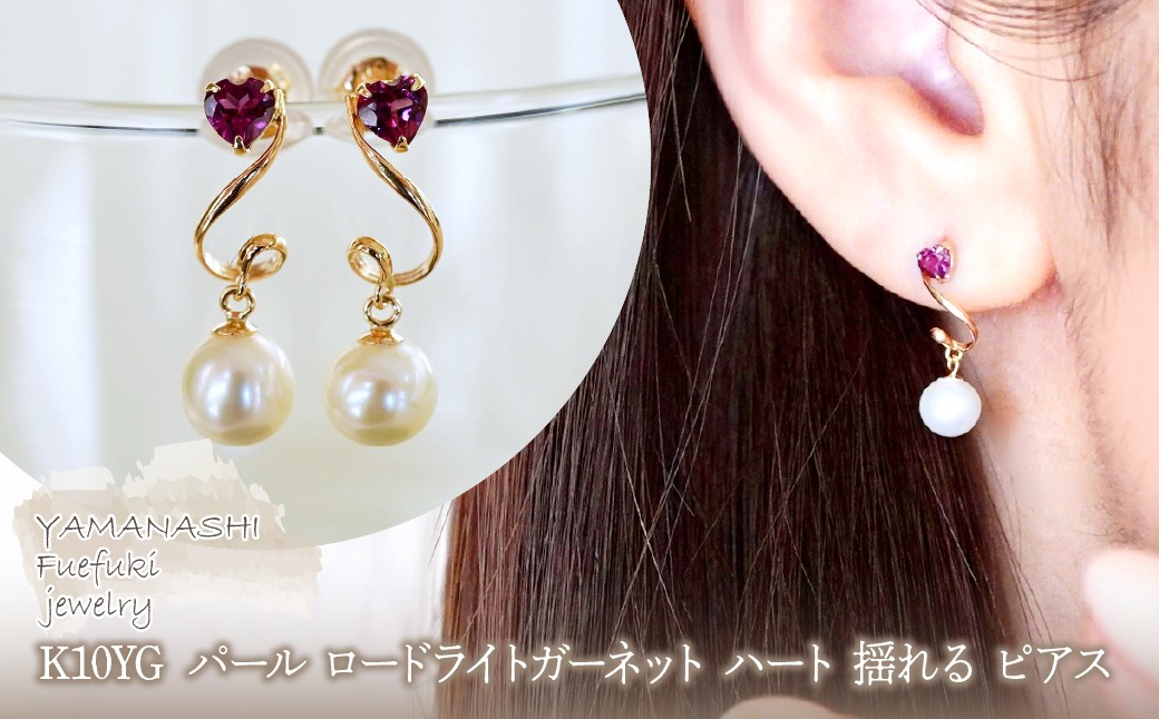 K10YG(10金) イエローゴールド パール ロードライトガーネット ハート 揺れる ピアス 保証書付 2122 242-063-c