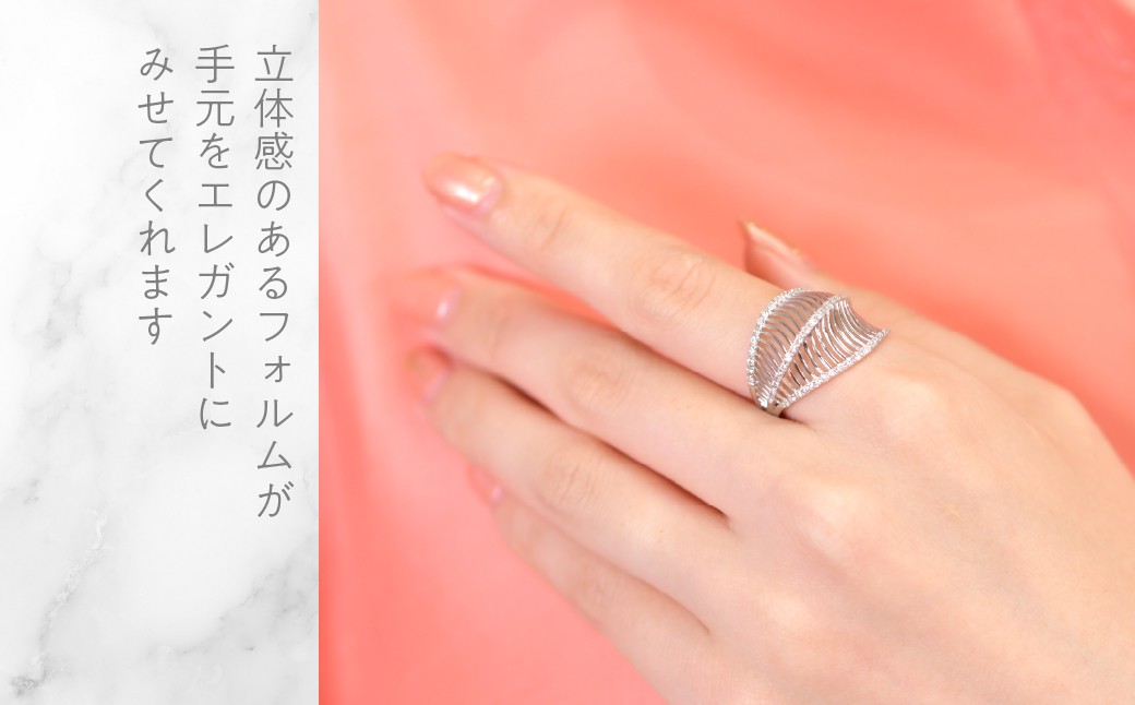 3ラインのダイヤモンドが美しい輝きをみせるメッシュデザインのリングです。華やかな輝きは他にはないエレガントな雰囲気を演出します。繊細なラインの1本1本を丁寧に磨きをかけているのでダイヤモンドと相まって一層美しく輝きます。メッシュのラインにはウェーブをかけているので立体感のあるフォルムが手元をエレガントにみせてくれます。天然ダイヤモンドの鑑別書をお付けしてお届けします。
