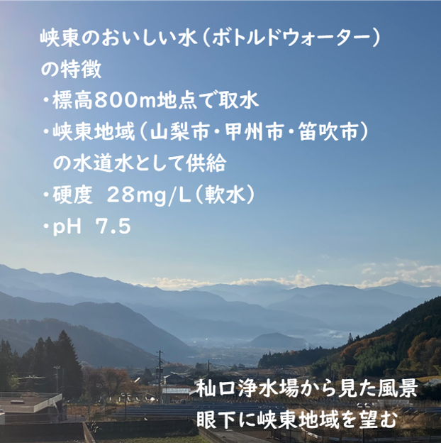 剣が峰など深い山々に育まれた清流を源とする「琴川の表流水」を峡東地域広域水道企業団杣口(そまぐち)浄水場で浄水処理した水を使用しております。