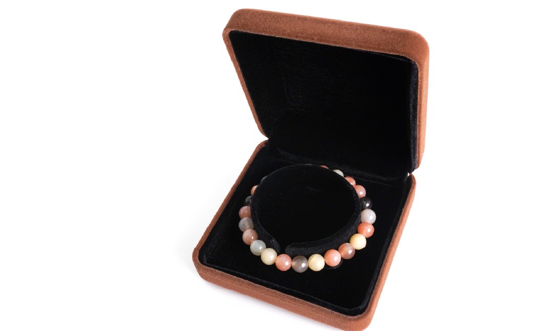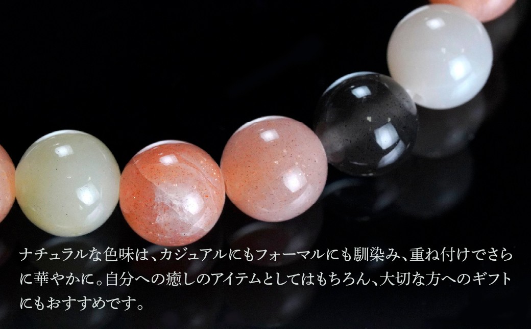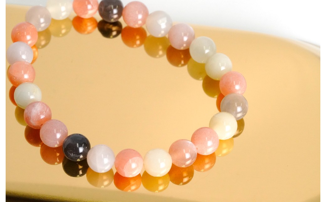 白・グレー・ピーチ・ベージュなど、自然が生み出した優しい色合いが手元に調和と静けさをもたらします。ムーンストーン特有の「シラー(光の揺らぎ)」が、角度によって神秘的な輝きを放ちます。