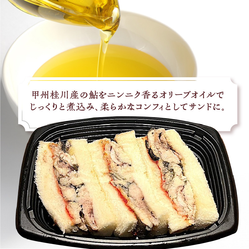 甲州桂川産の鮎をニンニク香るオリーブオイルでじっくりと煮込み、柔らかなコンフィとしてサンドに。