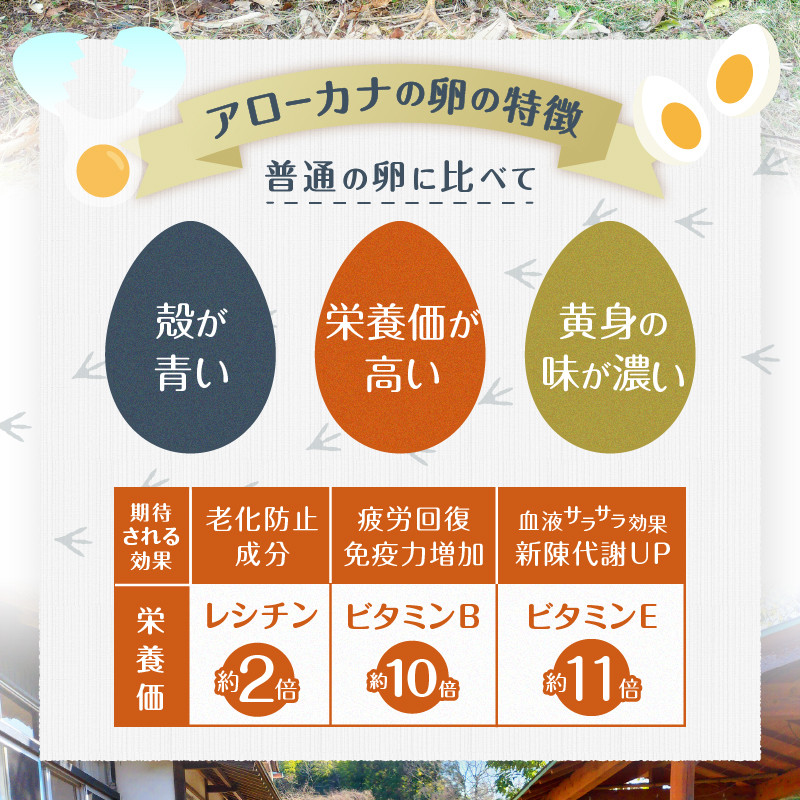 アローカナのたまごは、普通のたまごより黄身・味が濃いことが特徴です。また、栄養価も普通のたまごと比べて非常に高く、老化防止成分のレシチンが約2倍、疲労回復や免疫力増加の効果があるビタミンBが約10倍、血液サラサラ効果や新陳代謝アップするビタミンEがおよそ11倍と言われています。