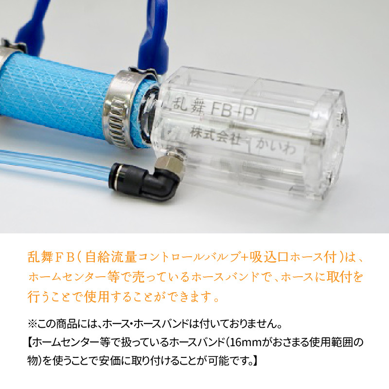 なお、乱舞FB(自給流量コントロールバルブ付)は、ホームセンター等で売っているホースバンドで、ホースに取付を行うことで使用することができます。