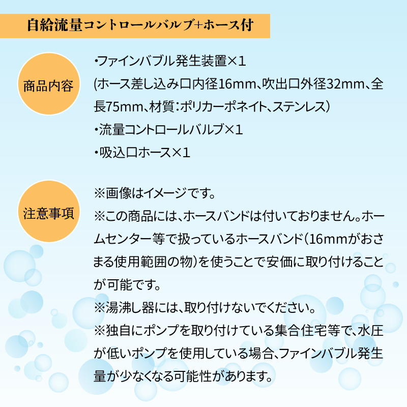 | 容量 | 【内容】 ・ファインバブル発生装置×1 (ホース差し込み口内径16mm、吹出口外径32mm、全長75mm、材質:ポリカーポネイト、ステンレス) ・流量コントロールバルブ×1 ・吸込口ホース×1 【原材料】 ・ポリカーポネイト ・ステンレス 【注意事項】 ※この商品には、ホース・ホースバンドは付いておりません。 【ホームセンター等で扱っているホースバンド(16mmがおさまる使用範囲の物)を使うことで安価に取り付けることが可能です。】 ※湯沸し器には、取り付けないでください。 ※独自にポンプを取り付けている集合住宅等で、水圧が低いポンプを使用している場合、ファインバブル発生量が少なくなる可能性があります。 |