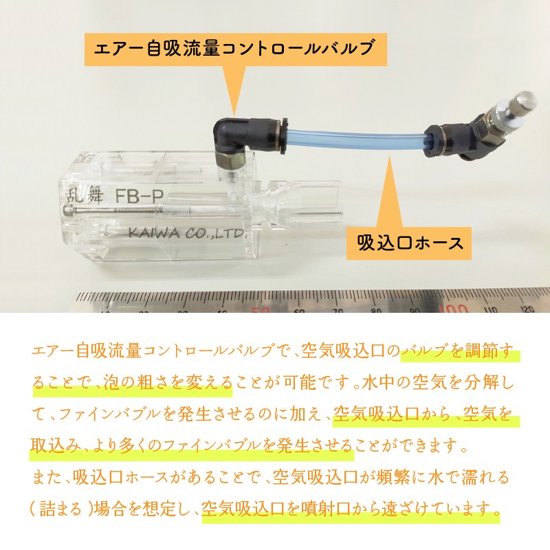 泡乱舞MB-P(エアー自吸流量コントロールバルブ付)は、泡乱舞MB-P(標準型)と異なり、空気吸込口のバルブを調節することで、泡の粗さを変えることが可能です。泡乱舞MB-P(標準型)が、水中の空気を分解して、ファインバブルを発生させるのに加え、泡乱舞MB-P(エアー自吸流量コントロールバルブ付)は、空気吸込口から、空気を取込み、より多くのファインバブルを発生させることができます。