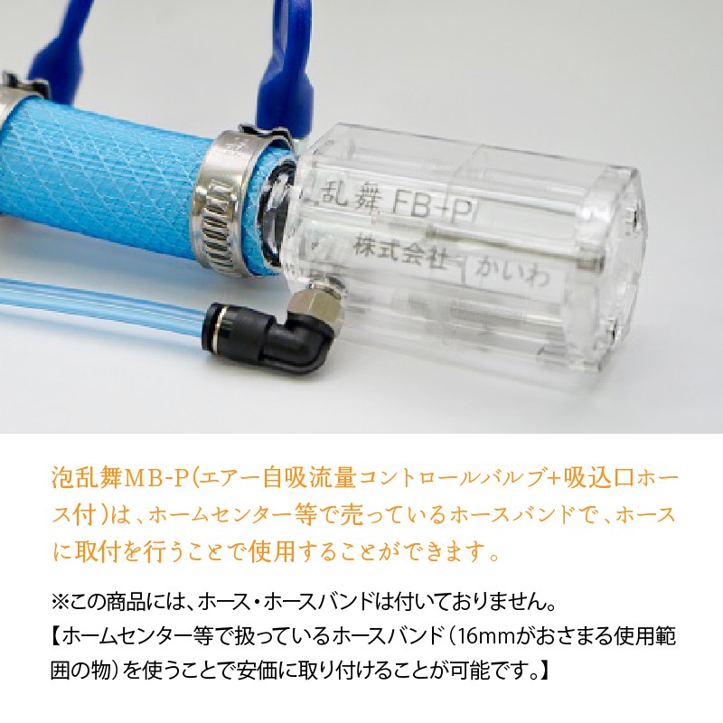 なお、泡乱舞MB-P(エアー自吸流量コントロールバルブ付)は、ホームセンター等で売っているホースバンドで、ホースに取付を行うことで使用することができます。