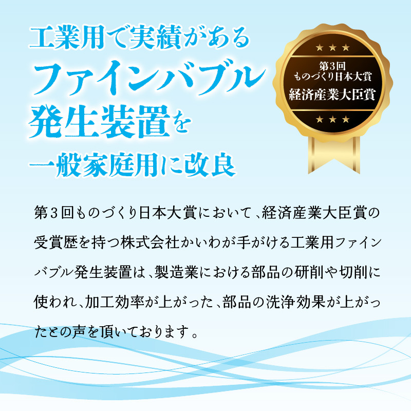 第3回ものづくり日本大賞において、経済産業大臣賞の受賞歴を持つ(株)かいわが手がける工業用ファインバブル発生装置は、製造業における部品の研削や切削に使われ、加工効率が上がった、部品の洗浄効果が上がったとの声を頂いております。