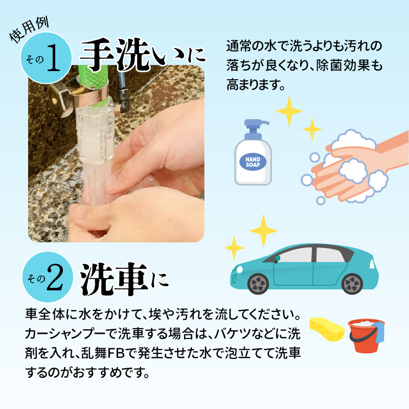 (1)ファインバブルとは ファインバブルとは、直径0.1mm未満の超微細な気泡のことです。 普段目にすることができる泡とは異なり、超微細な泡には、水の吸着効果や洗浄効果、植物の活性効果が高まるとされており、今、注目の技術です。 (2)工業用で実績があるファインバブル発生装置を一般家庭用に改良 第3回ものづくり日本大賞において、経済産業大臣賞の受賞歴を持つ(株)かいわが手がける工業用ファインバブル発生装置は、製造業における部品の研削や切削に使われ、加工効率が上がった、部品の洗浄効果が上がったとの声を頂いております。 そんな、工業用ファインバブル発生装置のノウハウを活かし、一般家庭用に改良したのが「乱舞FB」。シンプルで気取らない透明なデザインですが、中でファインバブルが発生している様子を実感することができます。 乱舞FB(標準型)は、ホームセンター等で売っているホースバンドで、ホースに取付を行うことで使用することができます。 (3)乱舞FBの使用例 ・手洗い 通常の水で洗うよりも汚れの落ちが良くなり、除菌効果も高まります。 ・洗車 車全体に水をかけて、埃や汚れを流してください。カーシャンプーで洗車する場合は、バケツなどに洗剤を入れ、乱舞FBで発生させた水で泡立てて洗車するのがおすすめです。 ・ペットのお世話 ファインバブルは、洗浄効果を高めるだけでなく、消臭効果もあるとされています。犬や猫のトイレ、鳥籠、食器を洗う際に使ってください。 ・野菜や魚を洗う 野菜の土や埃の洗浄効果を上げたり、生臭さを軽減するといった効果が期待できます。 【注意事項】 ※この商品には、ホース・ホースバンドは付いておりません。 【ホームセンター等で扱っているホースバンド(16mmがおさまる使用範囲の物)を使うことで安価に取り付けることが可能です。】 ※湯沸し器には、取り付けないでください。 ※独自にポンプを取り付けている集合住宅等で、水圧が低いポンプを使用している場合、ファインバブル発生量が少なくなる可能性があります。 ************** 【関連ワード】 洗浄 散水 園芸 ファインバブル 標準型 ファインバブル発生装置 送料無料