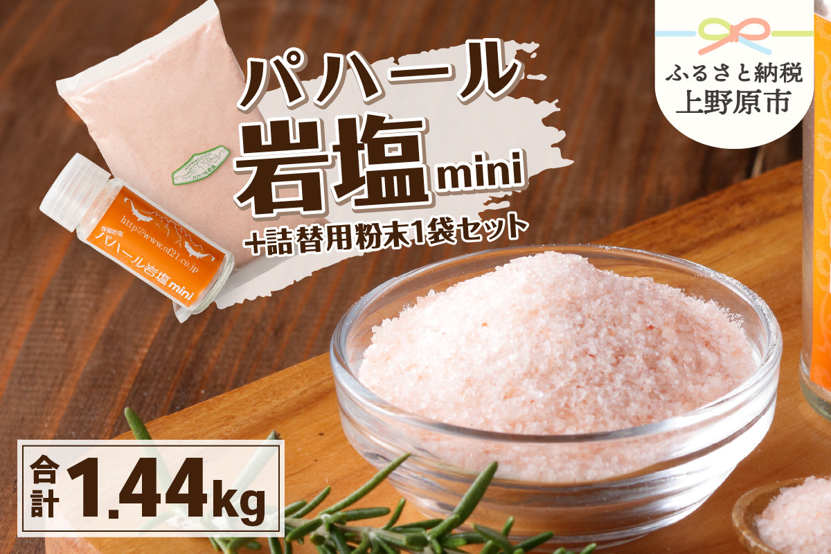 パハール岩塩mini+大容量1.4kg粉末×1袋 岩塩 塩 パハール岩塩 mini 天然 無添加 旨み 詰替用 粉末 大容量 1.4kg 贈り物 ギフト プレゼント 送料無料 山梨県 上野原市