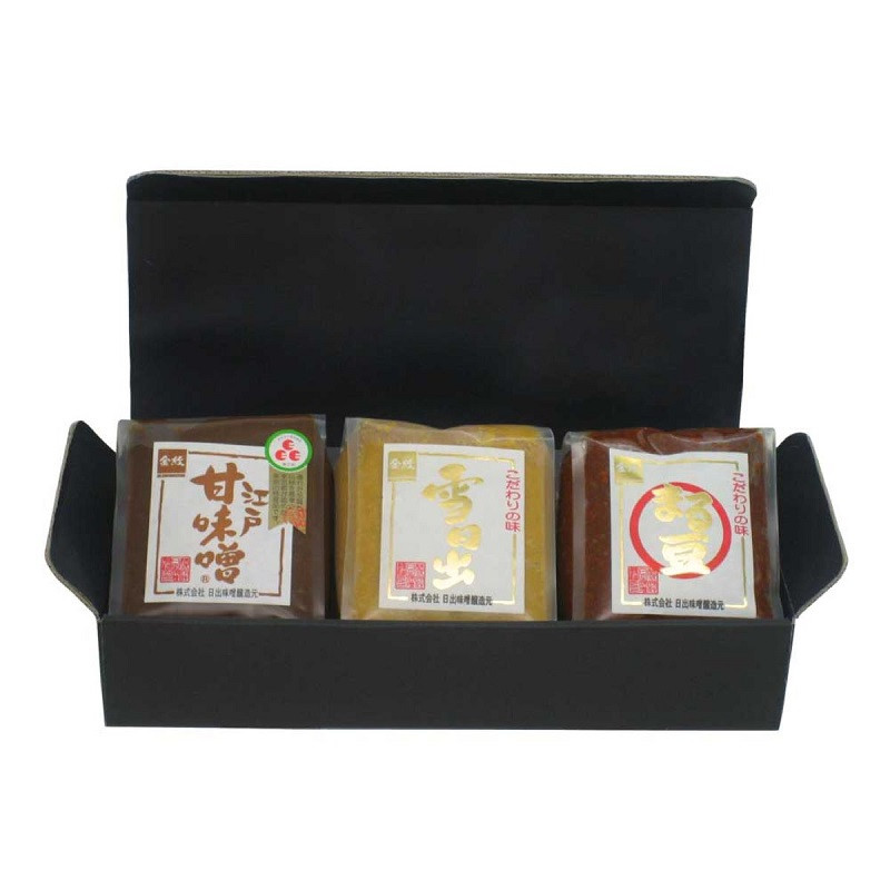 金紋江戸甘味噌500g×1、金紋雪日出味噌500g×1、金紋まる豆味噌500g×1のお味噌詰合せのギフトセットです。