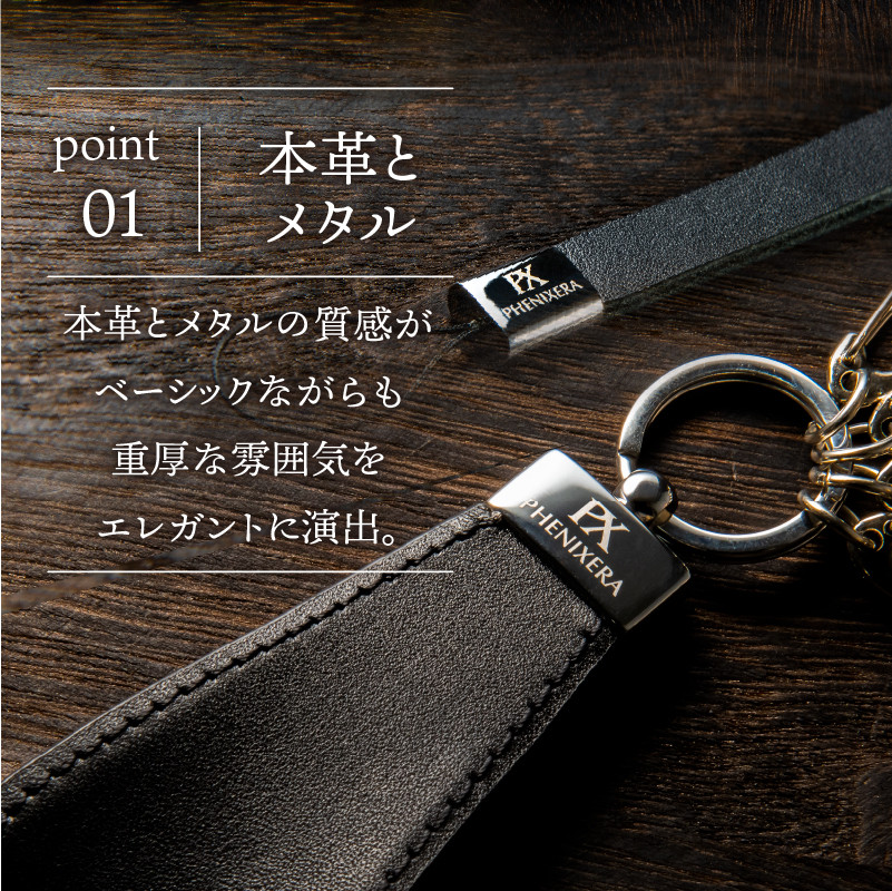 PHENIXERAブランドロゴが刻まれるメタルの重みがメンズアイテムとしての品格を引き立たせています。黒で統一されたエレガントで重厚な雰囲気をお楽しみください。