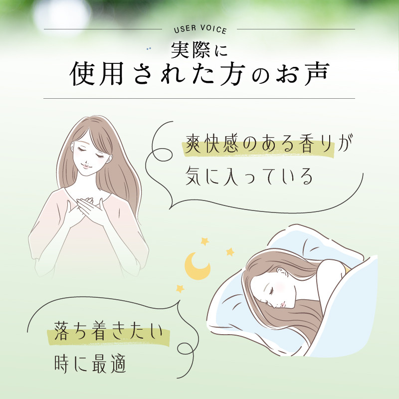 スーッと鼻を抜ける柔らかで爽快感のある香りは、気分転換やリラックスしたいときに最適です。