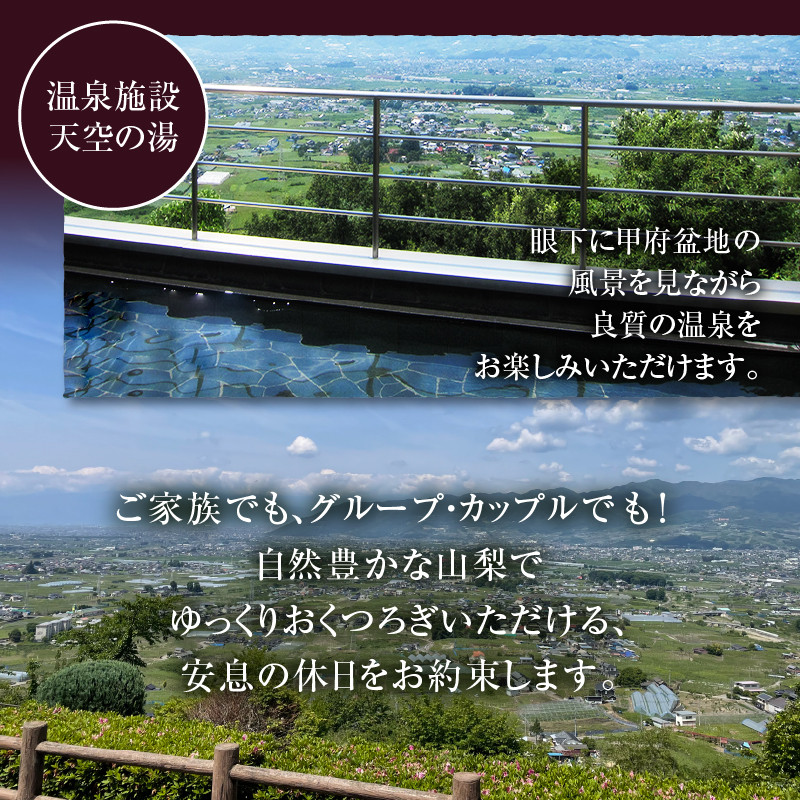また、温泉施設「天空の湯」では、眼下に甲府盆地の風景を見ながら良質の温泉をお楽しみいただけます。