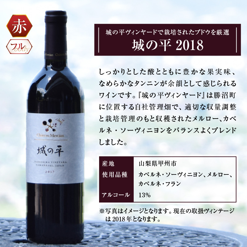 特徴:しっかりとした酸とともに豊かな果実味、なめらかなタンニンが余韻として感じられるワインです。『城の平ヴィンヤード』は勝沼町に位置する自社管理畑で、適切な収量調整と栽培管理のもと収穫されたメルロー、カベルネ・ソーヴィニヨンをバランスよくブレンドしました。