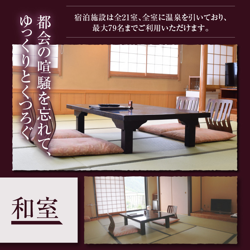 宿泊施設は全21室、全室に温泉を引いており、最大79名までご利用いただけます。