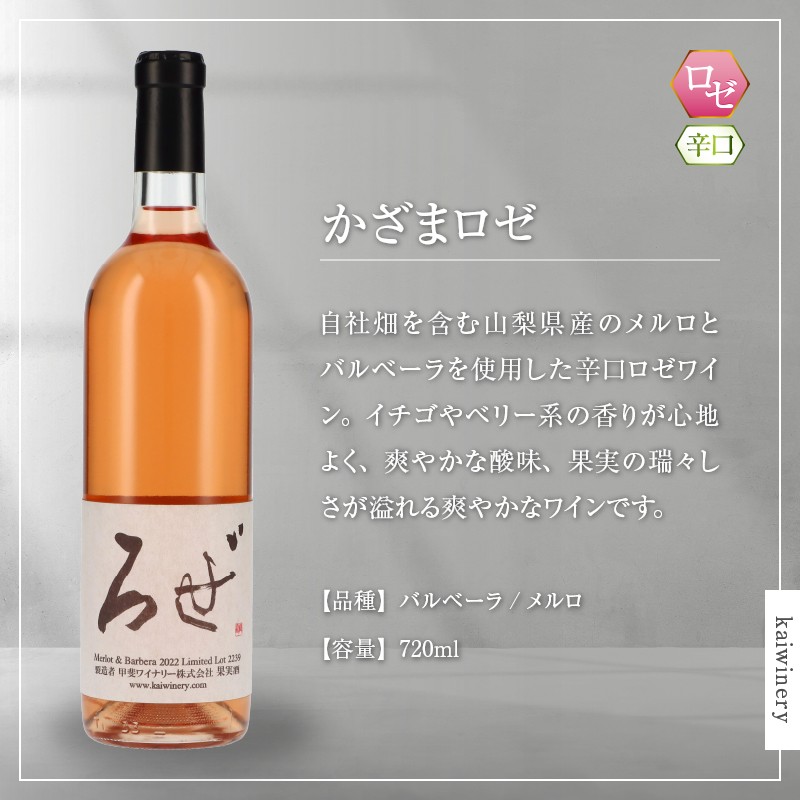 特徴:自社畑を含む山梨県産のメルローとバルベーラを使用した辛口ロゼワイン。イチゴやベリー系の香りが心地よく、爽やかな酸味、果実の瑞々しさが溢れる爽やかなワインです。