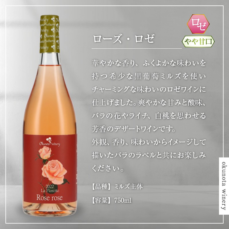 特徴:華やかな香り、ふくよかな味わいを持つ希少な黒葡萄ミルズを使いチャーミングな味わいのロゼワインに仕上げました。爽やかな甘みと酸味、バラの花やライチ、白桃を思わせる芳香のデザートワインです。外観、香り、味わいからイメージして描いたバラのラベルと共にお楽しみください。