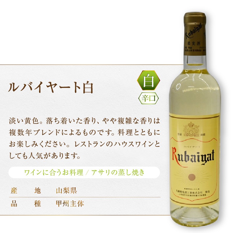 ■関連キーワード:ワイン 赤ワイン 白ワイン 2本 セット ルバイヤート テーブルワイン 赤 白 甲州ワイン 日本ワイン 山梨県 甲州市 勝沼 丸藤葡萄酒 母の日 父の日 記念日 ギフト 山梨県 甲州市