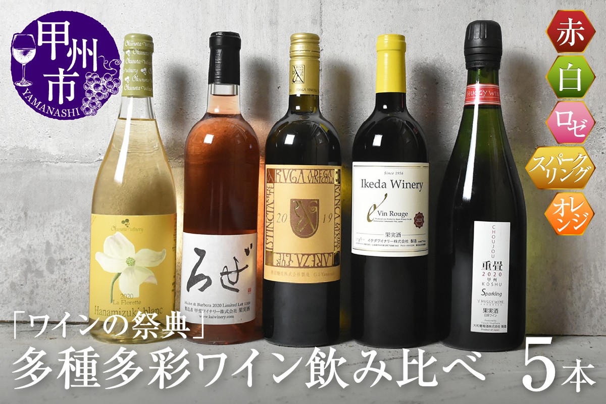 5種類のワインを各種1本ずつ、セットにしてお届けいたします。 「ワインの祭典」多種多彩ワイン飲み比べ5本セット(KSB)E-640 【ワイン 赤ワイン 白ワイン ロゼワイン オレンジワイン スパークリングワイン 甲州市 山梨県】