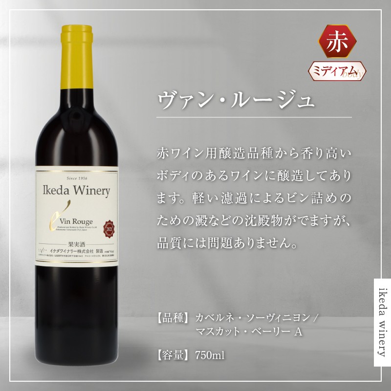 特徴:山梨県勝沼町は、日本一のぶどう収穫高を誇り、日本一のワイン産地を形成しています。“ヴァンルージュ”は赤ワイン用醸造品種から香り高いボディーのあるワインに醸造してあります。軽い濾過によるビン詰めのための澱などの沈殿物がでますが、品質には問題ありません。
