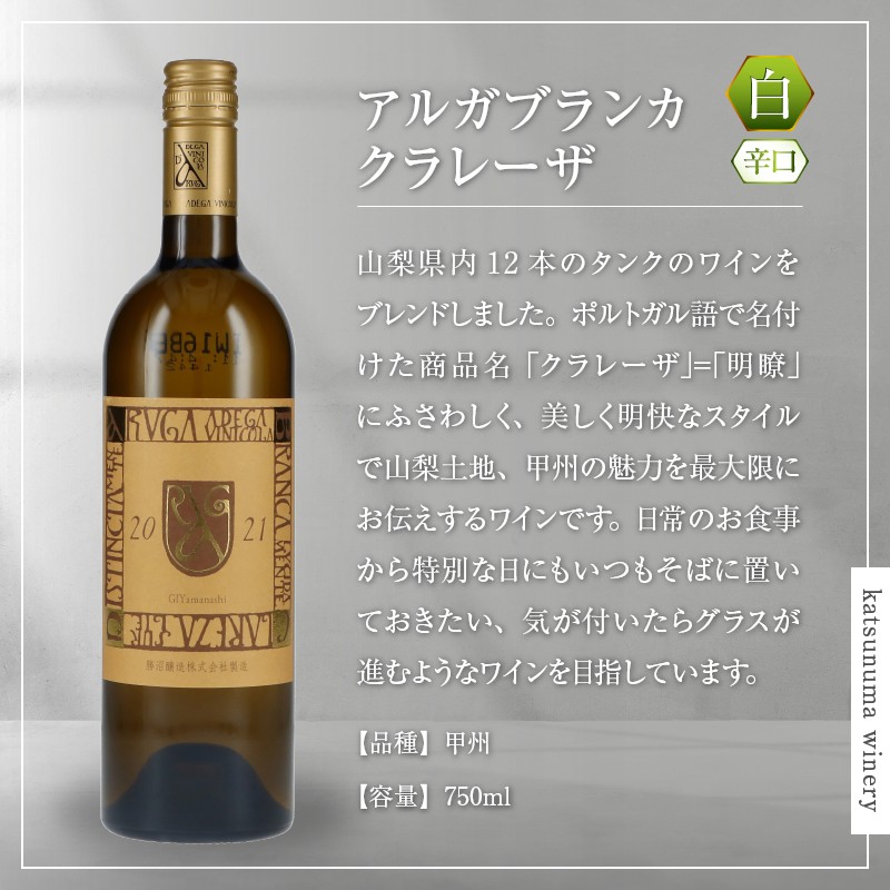 特徴:山梨県内では多地域で古くからブドウ栽培が盛んに行われています。地域により土壌条件や気象条件、農業者などの栽培環境が異なることから、多様な個性を持ったぶどうが育ちます。私たちはそれらの個性を偉大な自然からの恩恵と捉え、尊重した上で相補的なブレンドを行います。その結果、それぞれの個性が集まることで大きなエネルギーを持つ一つのワインが生まれると考えています。2021年のこのワインは山梨県内12本のタンクのワインをブレンドしました。ポルトガル語で名付けた商品名「クラレーザ」=「明瞭」にふさわしく、美しく明快なスタイルで山梨土地、甲州の魅力を最大限にお伝えするワインです。日常のお食事から特別な日にもいつもそばに置いておきたい、気が付いたらグラスが進むようなワインを目指しています。