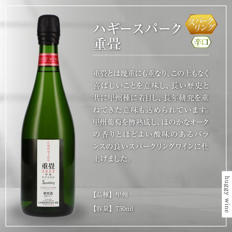 特徴:重畳とは幾重にも重なり、この上もなく喜ばしいことを意味し、これは当社の長い歴史と共に甲州種に着目し、長年研究を重ねてきた意味も込めて名付けました。甲州葡萄を樽熟成し、ほのかなオークの香りとほどよい酸味のあるバランスの良いスパークリングワインに仕上げました。