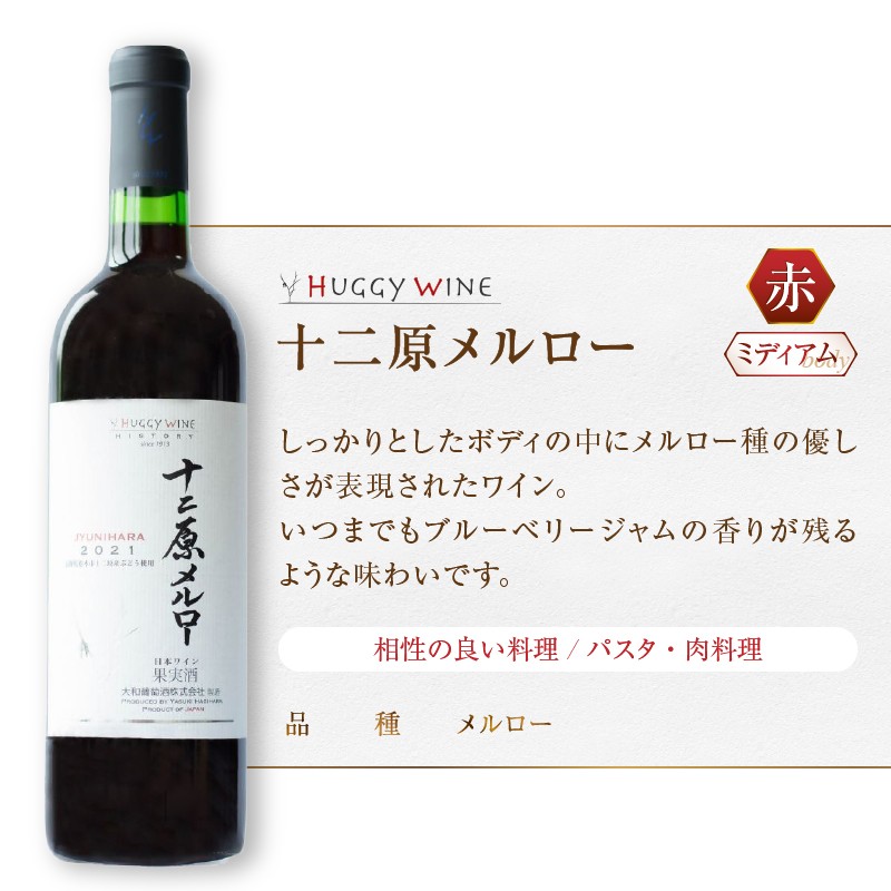 創業1913年と長い歴史を誇る大和葡萄酒より、しっかりとしたボディの中にメルロー種の優しさが表現された『十二原メルロー』とベーリーAの豊かな香りと果実味がしっかり表現されたフレッシュな味わいの『ベリー瑛』の赤ワイン2本セットをお届けします。大和葡萄酒が贈る二種類の赤ワインを是非一度ご賞味ください。