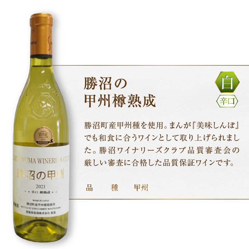 勝沼町産甲州種を使用。まんが『美味しんぼ』でも和食に合うワインとして取り上げられました。勝沼ワイナリーズクラブ品質審査会の厳しい審査に合格した品質保証ワインです。