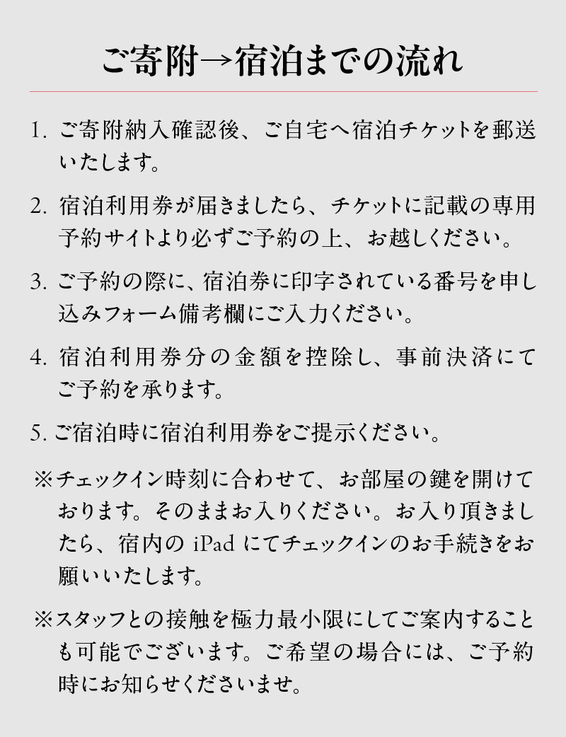 1.ご寄附納入確認後、ご自宅へ宿泊チケットを郵送いたします。