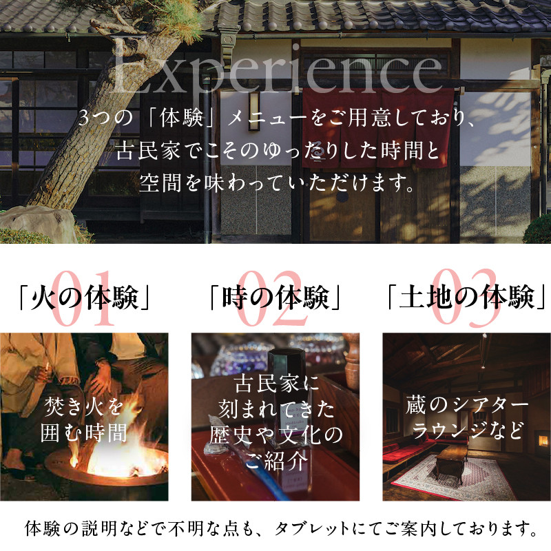 るうふではその土地ならではの3つの 「体験」メニューをご用意しており、「火の体験」(焚き火を囲む時間)、「時の体験」(古民家に刻まれてきた歴史や文化のご紹介)、「土地の体験」(蔵のシアターラウンジなど) と、古民家でこそのゆったりした時間と空間を味わっていただけます。体験の説明などで不明な点も、タブレットにてご案内しております。