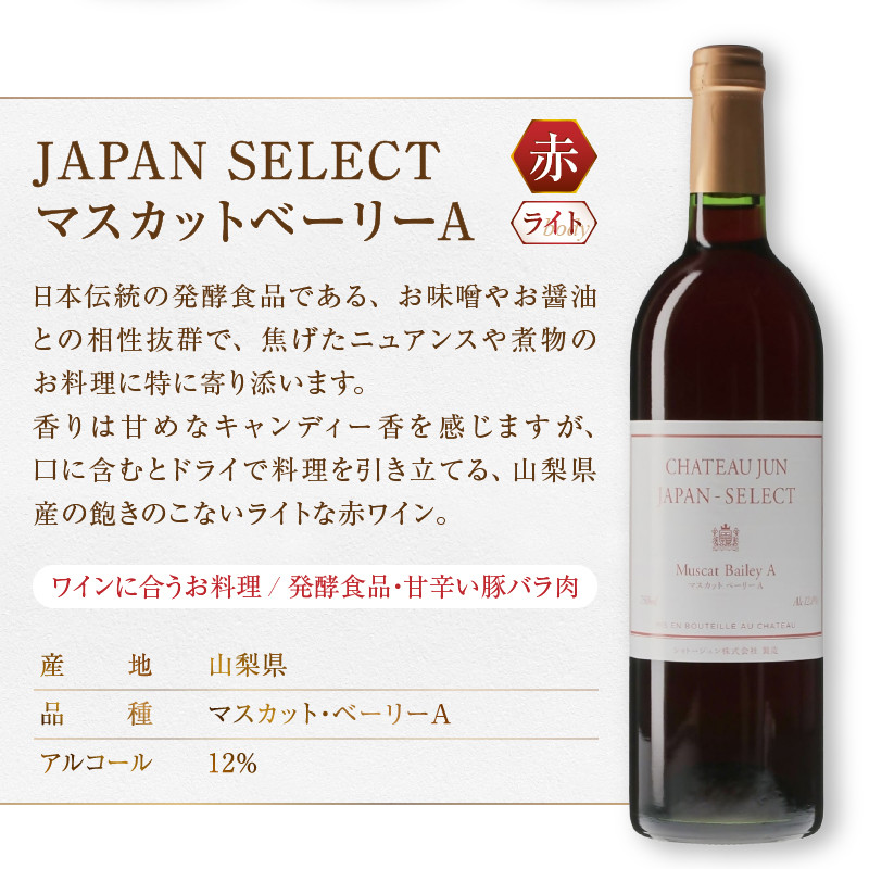 ■関連キーワード:ワイン 赤 白 ロゼ 750ml 3本 シャトージュン JAPAN SELECT デラウェア マスカットベーリーA 巨峰 ピオーネ 飲み比べ 母の日 父の日 記念日 プレゼント 贈答 山梨 甲州市