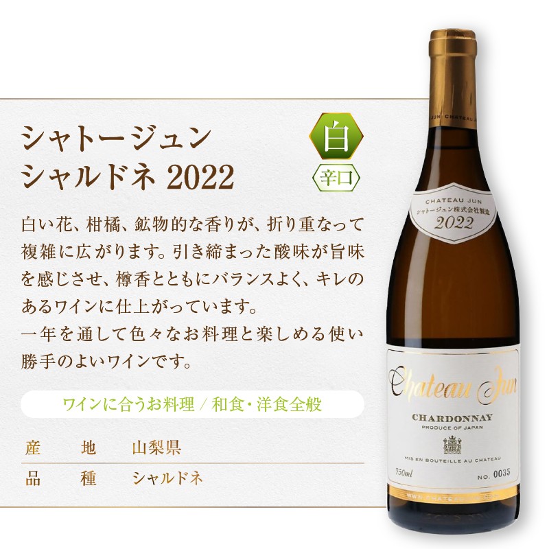 | 容量 | シャトージュン 甲州2022 750ml×1 シャトージュン 甲州2022樽熟成 フレンチオーク 750ml×1 シャトージュン シャルドネ2022 750ml×1 |