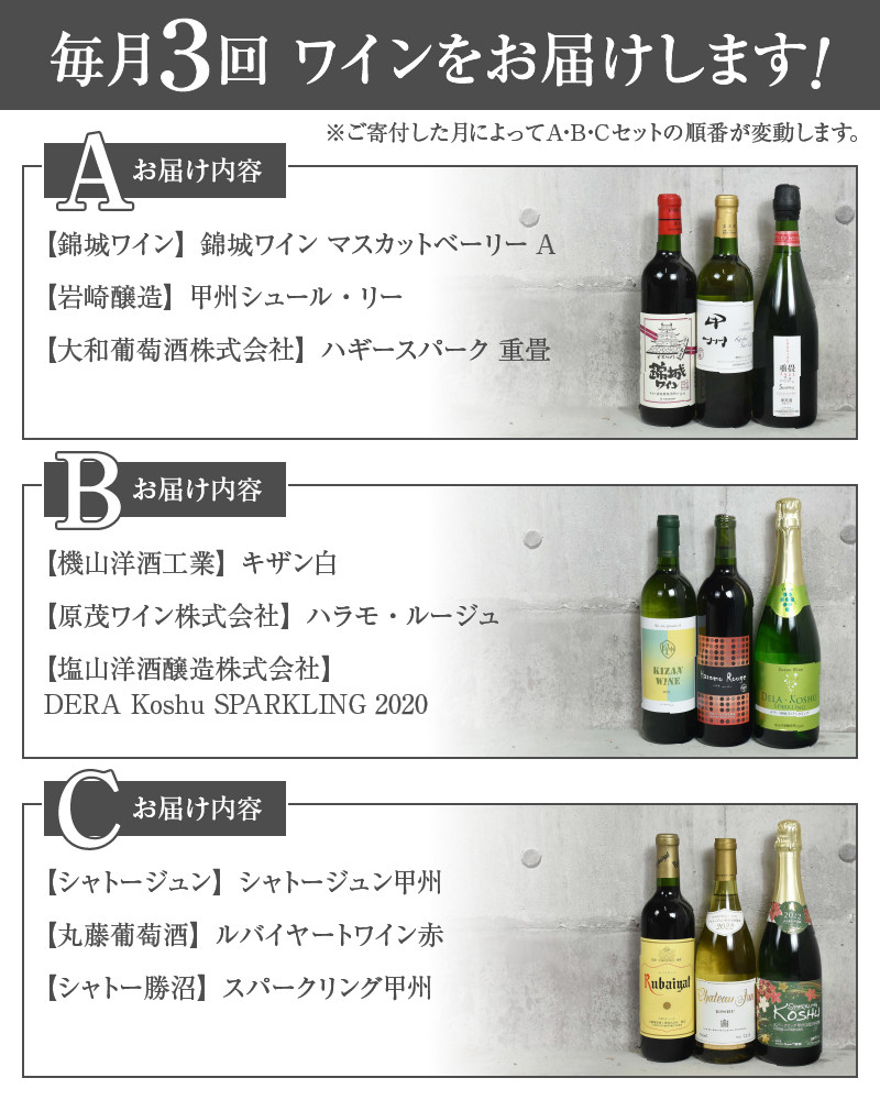 | 容量 | ※全3回定期便※ A 【錦城ワイン】錦城ワイン マスカットベーリーA 720ml×1 【岩崎醸造】甲州シュール・リー 720ml×1 【大和葡萄酒株式会社】ハギースパーク 重畳 750ml×1 B 【機山洋酒工業】キザンワイン白 750ml×1 【原茂ワイン株式会社】ハラモ・ルージュ 750ml×1 【塩山洋酒醸造株式会社】DERA Koshu SPARKLING 2020 720ml×1 C 【シャトージュン】シャトージュン甲州 750ml×1 【丸藤葡萄酒】ルバイヤートワイン赤 720ml×1 【シャトー勝沼】スパークリング甲州 750ml×1 ※ご寄付いただいた月によって発送の順番が変動する場合がございます。 |