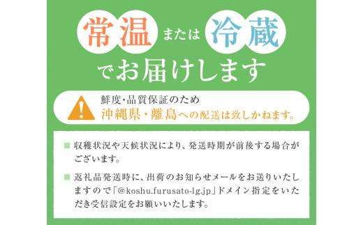 ・返礼品発送時に、出荷のお知らせメールをお送りいたしますので「@koshu.furusato-lg.jp」ドメイン指定をいただき受信設定をお願いいたします。