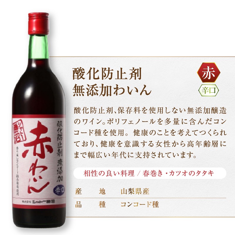 酸化防止剤、保存料を使用しない無添加醸造のワイン。ポリフェノールを多量に含んだコンコード種を使用。健康のことを考えてつくられており、健康を意識する女性から高年齢層にまで幅広い年代に支持されるシャトー勝沼の主力商品です。