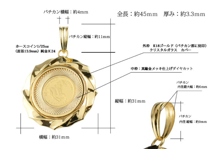 | 容量 | コイン ペンダントトップ1点 ※こちらはペンダントトップのみの販売です。 ネックレスチェーンは付属致しません。 ■地金素材 コイン : 英連邦ツバル政府発行 ツバルホースコイン 1/25オンス(直径13.9mm)純 金(999.9) 外枠 : K18ゴールド(バチカン部に刻印アリ) 中枠 : 真鍮金メッキ仕上げ(ダイヤカット) 両面クリスタルガラス枠付 ■刻印 コイン:999.9(純金) コイン枠:K18 ■デザイン 最大縦幅:約45mm 厚み:約3.3mm デザイン幅:約31mm×31mm バチカン内径縦幅:約9mm 内径最大幅:約6mm 総重量 約8.15g ※純金とは999.9(=99.9%)の超高純度の金の事です。 ★クリスタルガラスカバーは防水ではなく、 水分がガラス内に入る場合がございますので、湿気にご注意下さい。 ※注意※ 真鍮部分は変色する場合もございます。 着用したままのご入浴や水泳等はお避け下さい。 ■付属品 お品証明書 ジュエリーケース |