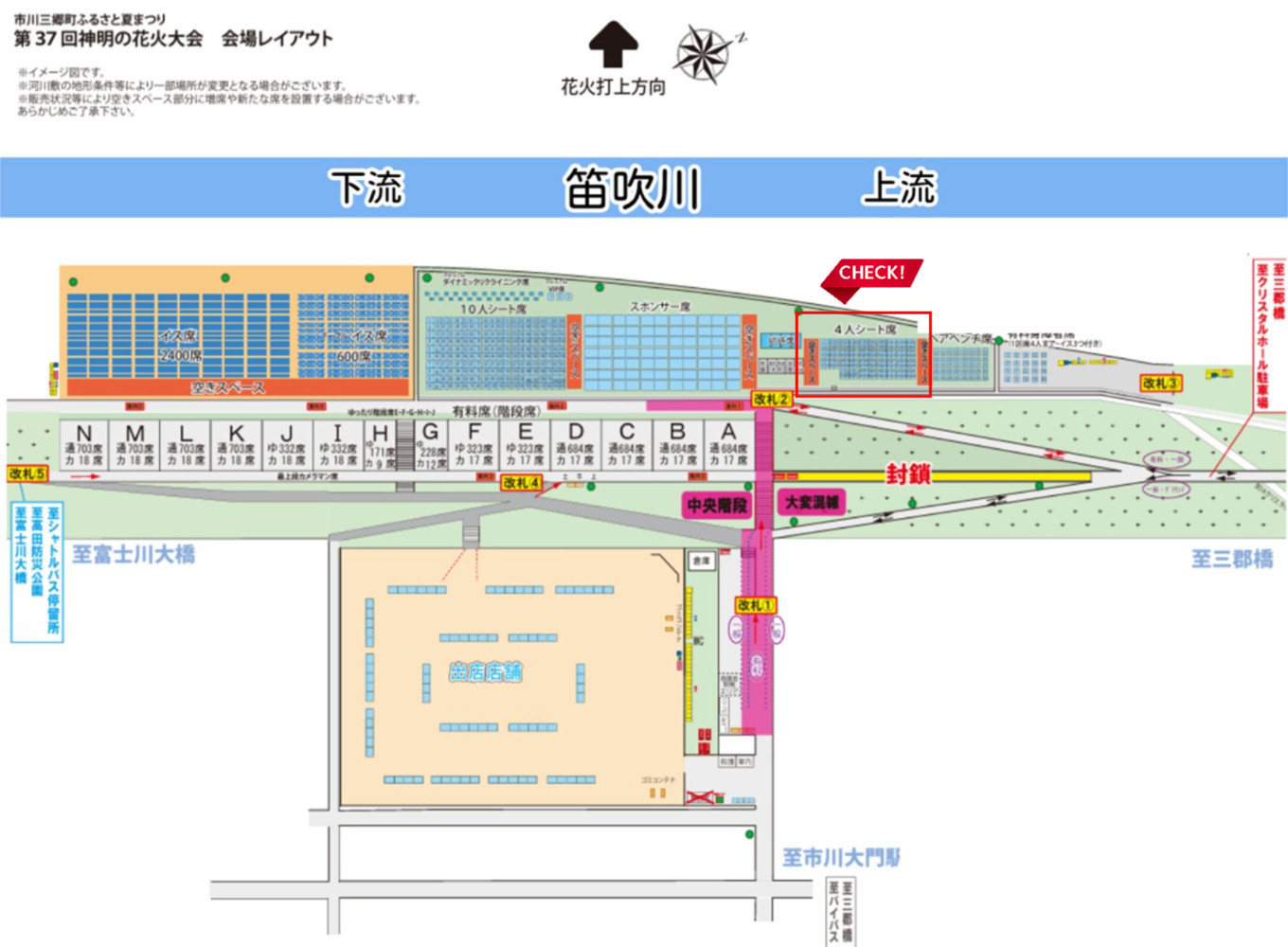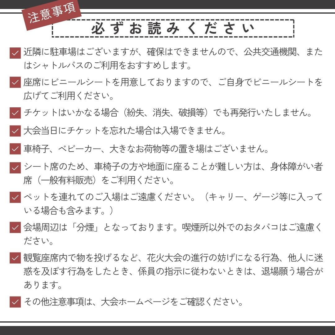| 容量 | 山梨県市川三郷町町制施行20周年記念 「第37回 神明の花火大会」有料シート席(4名様用シート席)チケット 座席の広さは奥行1.8m×1.8m 開催日:令和7年8月7日(木) 午後7時15分~ 場所:山梨県西八代郡市川三郷地内(三郡橋下流笛吹川河畔) ※荒天の場合は8月8日、9日に順延 |