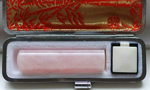 【天然石】紅水晶印鑑(ローズ・クォーツ) 15㎜丸60㎜丈 トカゲ革ケース 開運社本店[5839-1722]