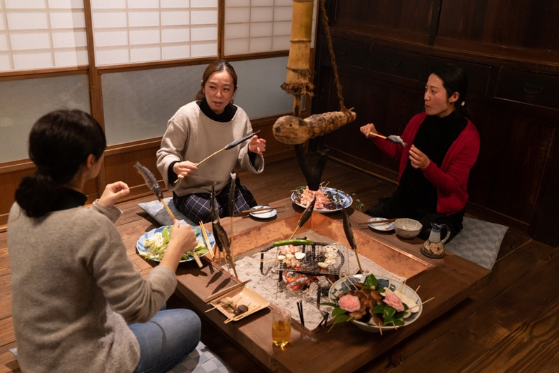 古民家一棟貸しの宿「月夜見山荘」に宿泊し、山菜、きのこ、川魚、ジビエなどの四季の山の恵みを満喫。