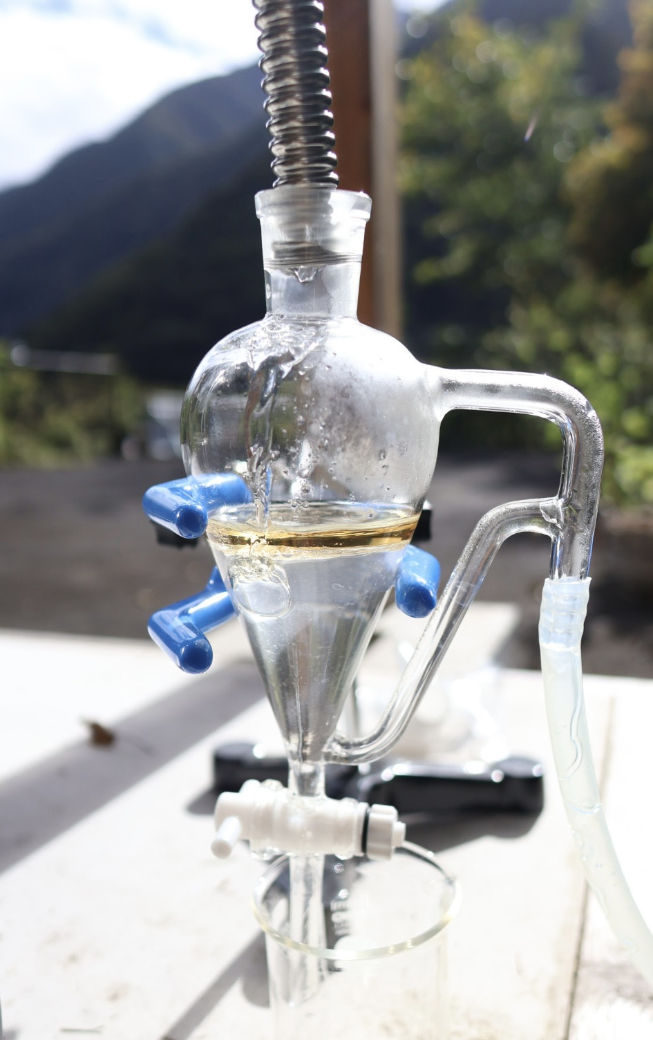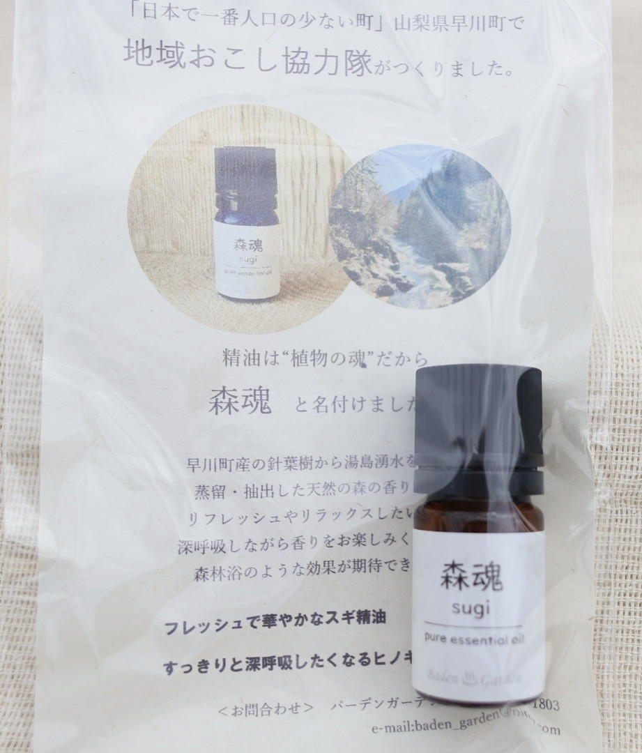 早川町内の杉葉から、町内の豊富な湧き水を使って水蒸気蒸留・抽出した天然のスギの香りです。