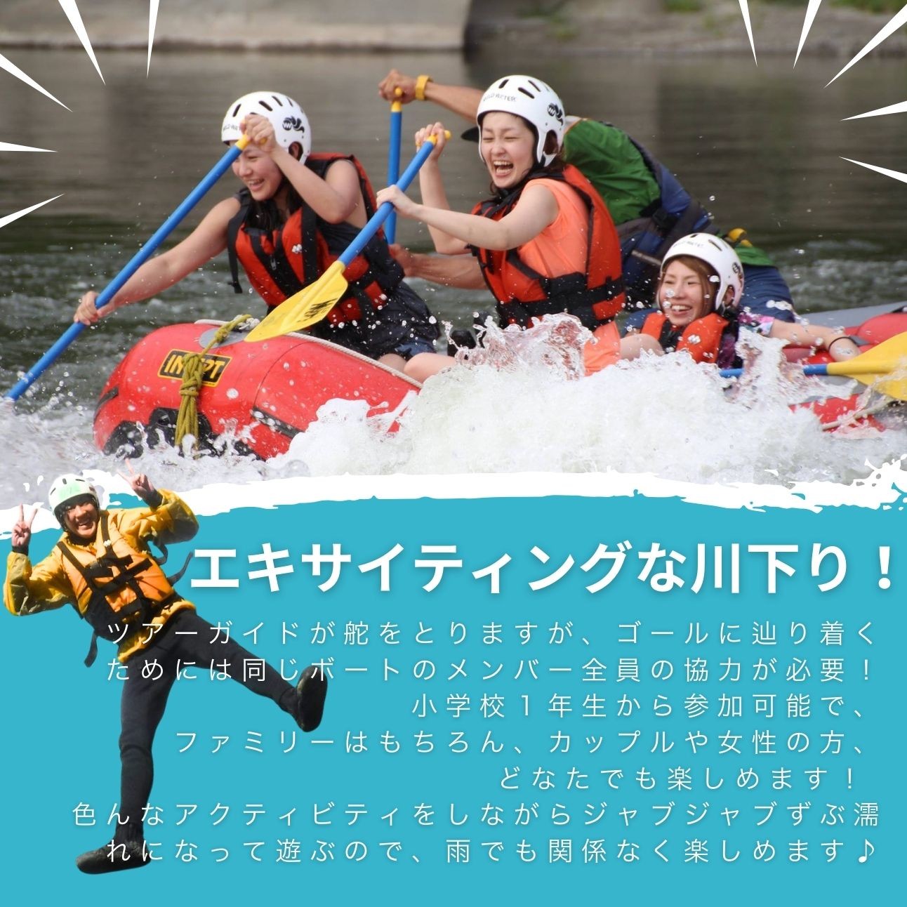 ツアーガイドが舵をとりますが、ゴールに辿り着くためにはボートのメンバー全員の協力が必要!