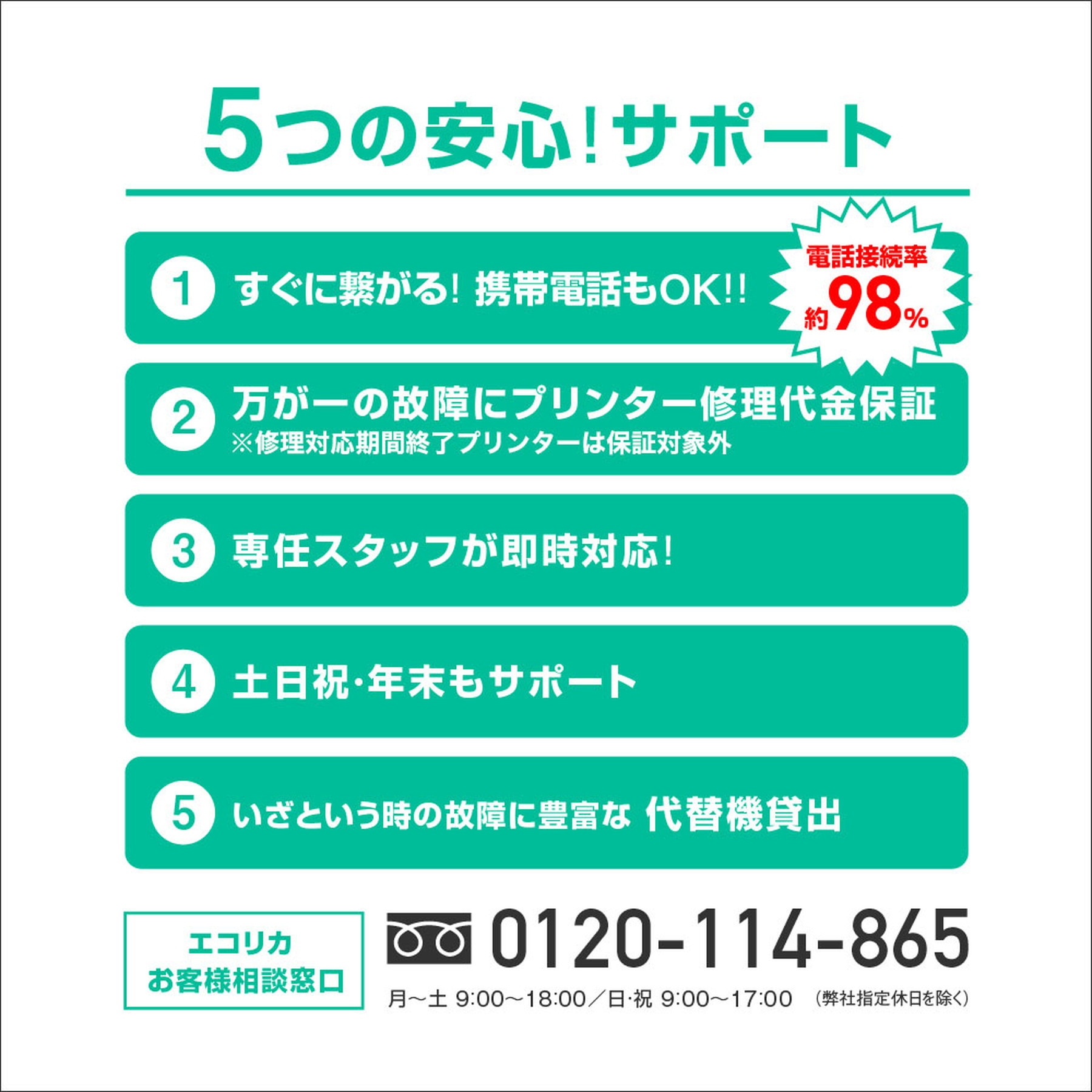プリンターの修理保証※や代替機サービス、すぐに繋がる電話接続率約98%を達成した充実のサポートにより安心してお使いいただけます。